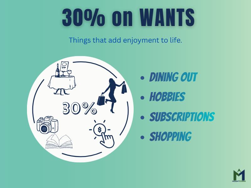 - 30% for Wants (Dining out, entertainment, hobbies).